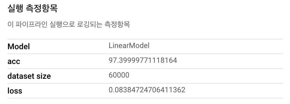 - 3: Metrics은 위와같이 log_metric 으로 값을 주면 Vertex AI Pipeline의 “실행 측정항목” 에서 확인할 수 있을 뿐만 아니라 여러개의 파이프라인을 선택하여 Metrics에 입력한 값을 기반으로 서로 비교할 수 있다.