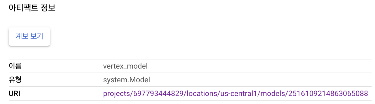 - 4: component의 Output으로 지정한 vertex_endpoint , vertex_model 이 처음으로 등장했는데, 단순히 컴포넌트의 결과로서 배포된 모델의 정보와 Endpoint의 정보를 확인하기 위함이다. 사실 꼭 필요한 부분은 아니다.