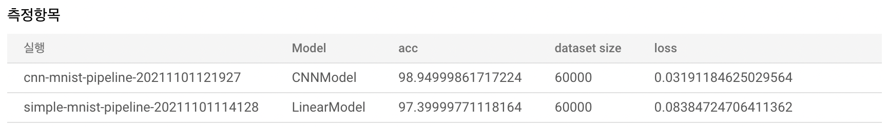 Metrics의 log_metric 으로 지정한 뒤 학습의 결과는 다음과 같이 확인할 수 있다.