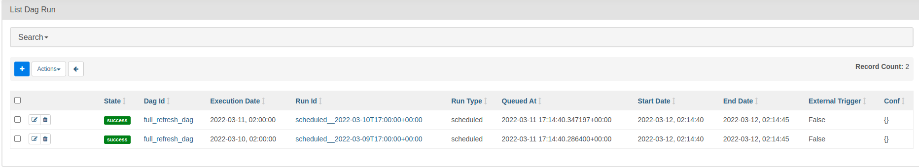 이 글을 작성하는 시점은 2022.03.12 02:21분을 지나고 있어 Dag가 2번 실행된 걸 확인할 수 있다.