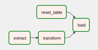 그리고 이렇게 정의된 Task들간의 의존성을 지정하여 병렬적으로 Task를 실행시킬 수도 있다. 아래에서 reset_table_task와 extract_task, transform_task는 task간 연관이 없기 때문에 병렬적으로 실행되도록 하였다.