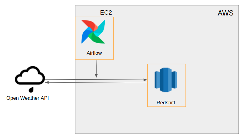 위 다이어그램과 같이 Airflow를 사용해 Open Weather API에서 Redshift로 데이터를 가져옵니다.